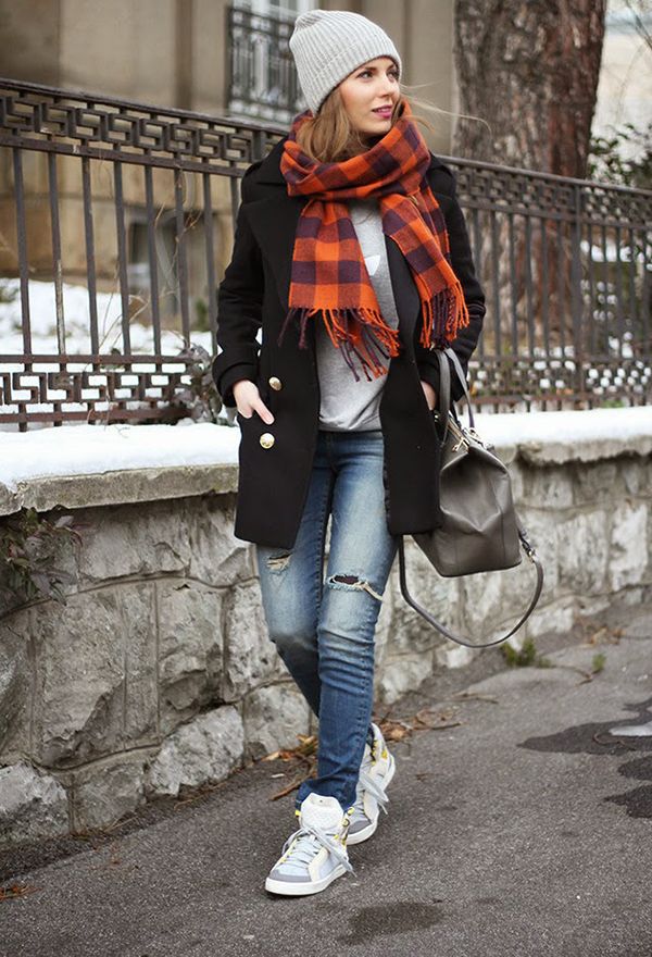 - Джинсы и свитеры. Классическое сочетание – джинсы и уютный свитер – отлично смотрится с кроссовками. Выбирайте модели джинсов свободного кроя или прямого силуэта. Такая комбинация подойдет как для повседневной жизни, так и для встреч с друзьями.