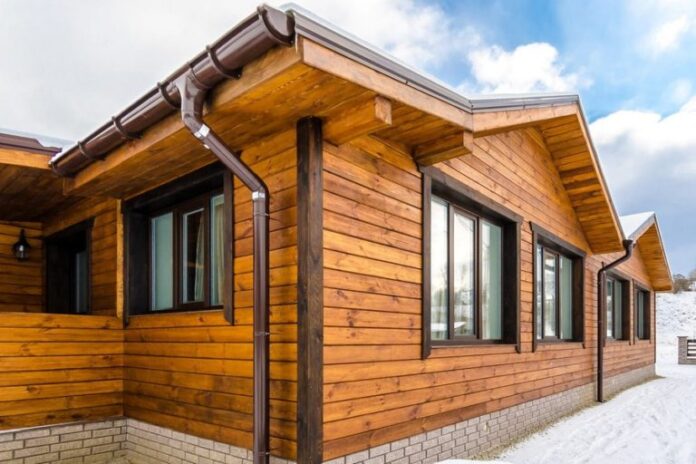 При облицовке стены здания выглядят так, будто они собирались из массивных элементов. Имитацией бруса оформляют не только каркасные дома, но и каменные, бетонные стены, поверхность из искусственного камня.